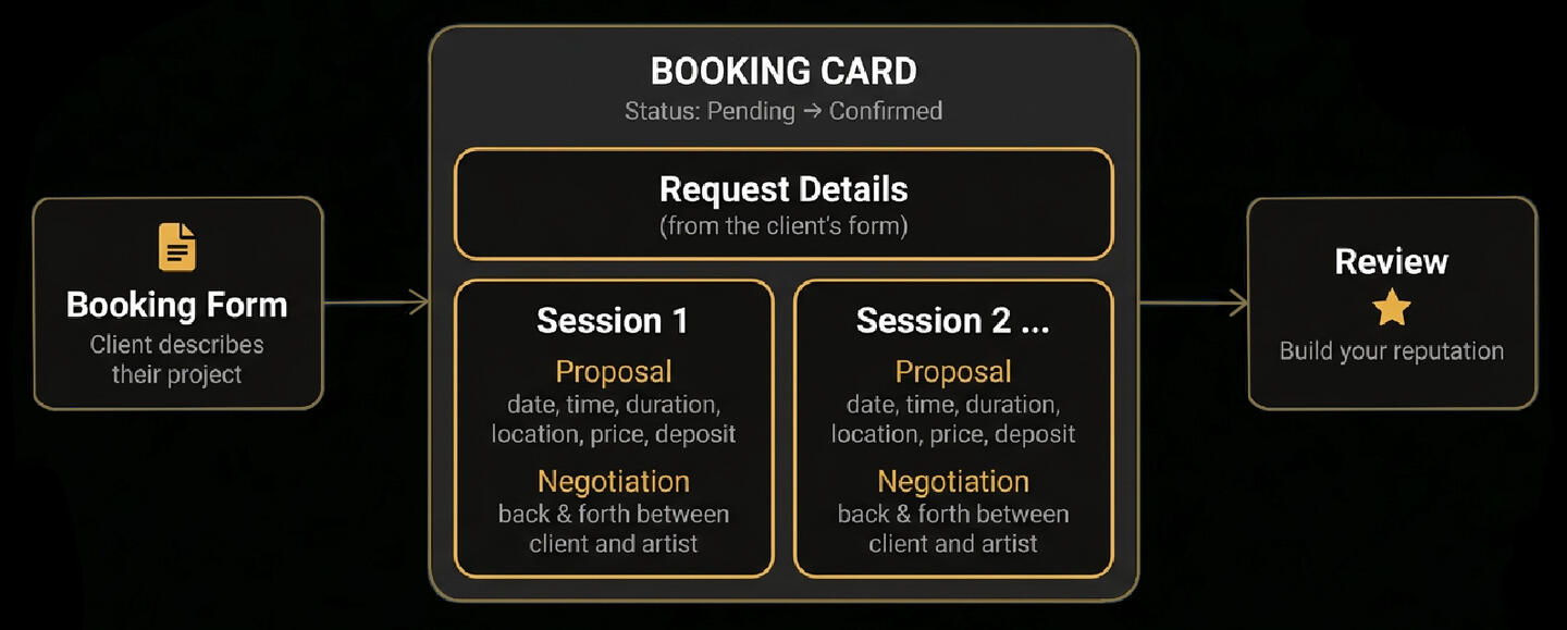 Post your work, get discovered through feeds and the map. Manage bookings, plan guest spots, track your income. No algorithm to fight — just your art, found by the right people.